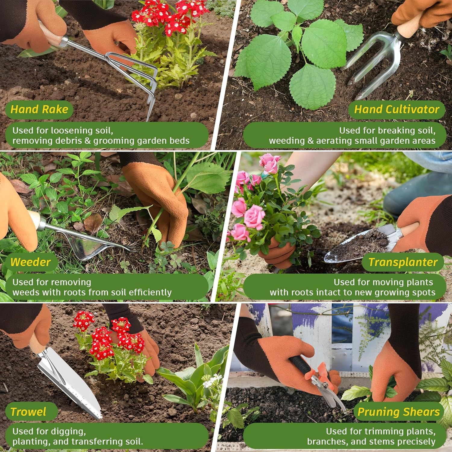 Complete Gardening Kit – Includes Storage Bag,Pruning Shears,Hand Rake,Weedier,Transplanter,Cultivator,Gloves,12Pcs T-Type Plant Lables,Spray Bottle,Plant Repotting Mat for all garden tasks.Durable & Rust-Proof – High-grade stainless steel construction withstands heavy use and harsh weather.Stylish Storage Bag – Made of extra-sturdy 600D Oxford cloth,Floral-patterned tote keeps tools organized and protected.Comfortable Wooden Handles – Ergonomic design reduces hand fatigue during long use.