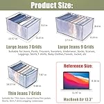 Size of clothing organizer: The jean organizer for closet has many size designs, which can meet your entire storage needs(Thin Jeans 7 Grids Size:14.17*9.84*7.87 inch; Large Jeans 9 Grids Size: 17.3*11.8*8.6 inches) . Tips: For very large pants, we suggest you buy the large Jeans 9 Grids Size type