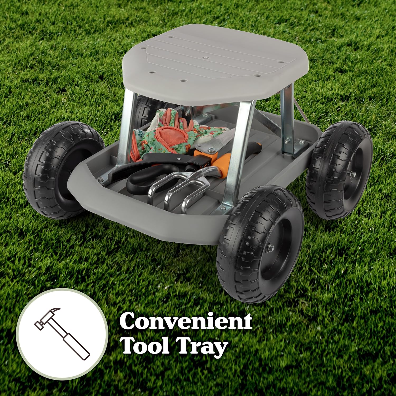 Gardening Stool – Rolling Garden Seat with Wheels and Storage Tool Tray – Garden Cart Scooter – Yard Tools by Pure Garden (Gray)