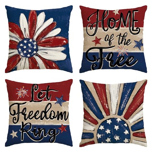 AVOIN colorlife Let Freedom Ring Stars Fireworks Red White Flower Throw Pillow Covers, 18 x 18 Inch 4th of July Patriotic Independence Memorial Day USA Flag Cushion Case for Sofa Couch Set of 4