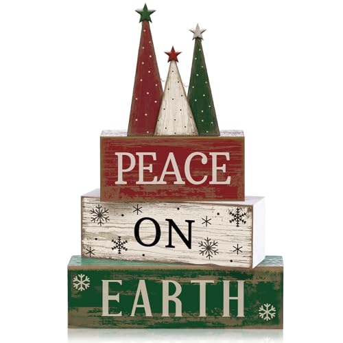4 Pcs Christmas Table Decoration Wooden Christmas Tree Sign Winter Tiered Tray Decor Decorative Red Green and White Tree Block Signs Xmas Table Centerpiece Farmhouse Decor for Home Kitchen