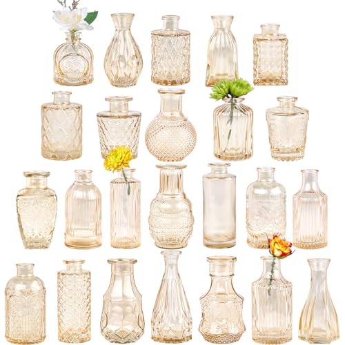 【 Vintage Style 】TBWIND small flower bud vases set of 24 ,each amber glass vase is decorated with etched patterns to further enhance its attractiveness. The different desgin mini vase is pleasant to the eyes even without flowers. Whether you're aiming for a minimalist look or a more elaborate arrangement, these different desgin mini vases provide the perfect foundation for your creative ideas.