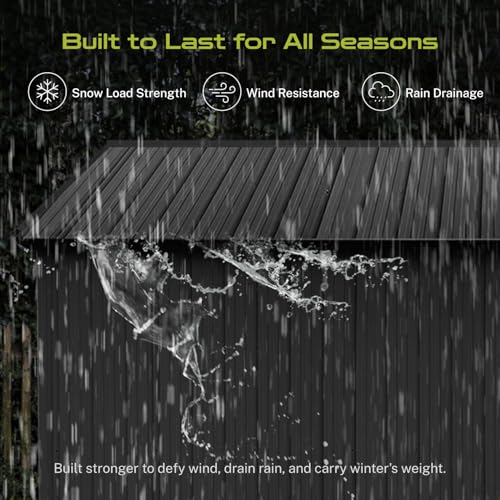 ☔ [Sloped Roof for Superior Weather Protection] Designed for real-world conditions, the efficient sloped roof system guarantees optimal rainwater drainage, preventing damaging pooling and leaks. This key feature in our storage buildings and sheds clearance design minimizes maintenance and ensures your tools, equipment, and belongings stay consistently dry inside