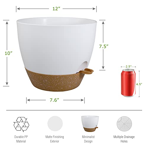 12inch 2Pack Large Self Watering Planters, Plastic Plant Pots with 60oZ Removable Deep Reservoir and Multi Mesh Drainage Holes for Indoor Outdoor Garden Plants and Flowers, White with Brown