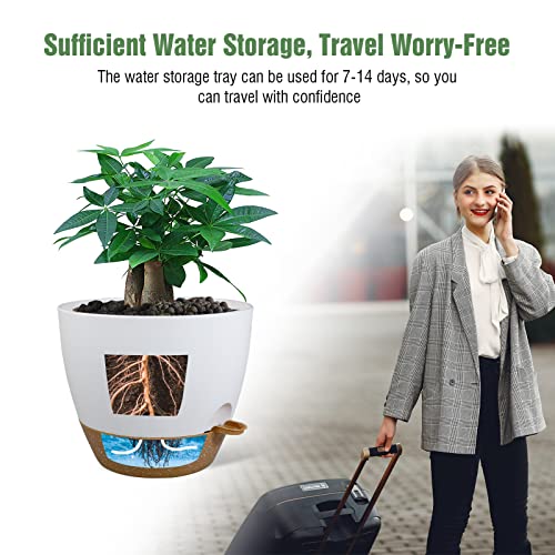 [60OZ LARGE DEEP RESERVOIR, 2~3 WEEKS EXTRA WATER] 12inch 2Pack Extra large Self Watering Pot with deep reservoir makes it easy for when go on vocation that no need someone to come over water plants and flowers. Built-in tray protects decks, patios, or indoor surfaces. (Dimension: 12” W x 10” H)