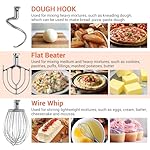 VERSATILE ATTACHMENTS: This stand mixer includes a stainless steel bowl and 3 specialized attachments: a dough hook, flat beater, and wire whip. The dough hook kneads and mixes heavy ingredients (e.g., bread, pizza dough, pie crust). The flat beater is for creaming butter/sugar, folding, and emulsifying (e.g., cake batter, cookie dough, frosting, mashed potatoes, meat filling, cheesecake filling). The wire whip primarily whisks light mixtures (e.g., cream, egg whites). These attachments meet diverse recipe needs