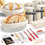 SOURDOUGH BREAD STARTER KIT: Amgkonp sourdough starter kit including 10″ oval cotton rope bread basket and 11″ round cotton rope bread basket with 4 cloth liner. 2 lid and 2 sourdough starter jar, 2 thermometer band, 2 feeding day tracker band ,1 Metal dough scraper, 1 baking mat, 1 Stainless steel agitator, 2 breathable cloth cover, 2 silicone scraper, 1 silicone brush, 1dough proofing cloth, scraper with 5 interchangeable blades.Homemade bread baking delicious, let you enjoy DIY fun