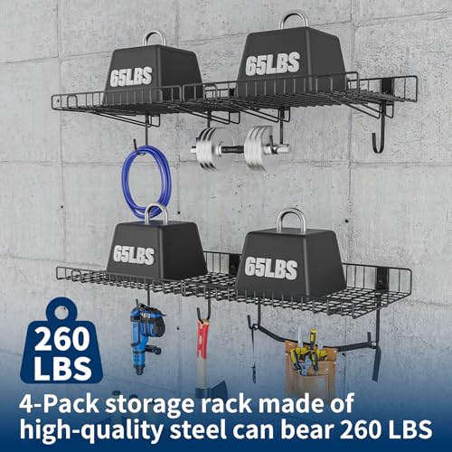 HEAVY DUTY METAL WALL SHELF: Hanging Garage Shelf is made of high-quality steel with a powder-coated finish for a sturdy structure. After extensive load-bearing testing, each metal rack has a load-bearing extent of 65 pounds, and 4 metal racks have a load-bearing extent of 260 pounds, providing a sturdy and secure storage solution for your valuables.