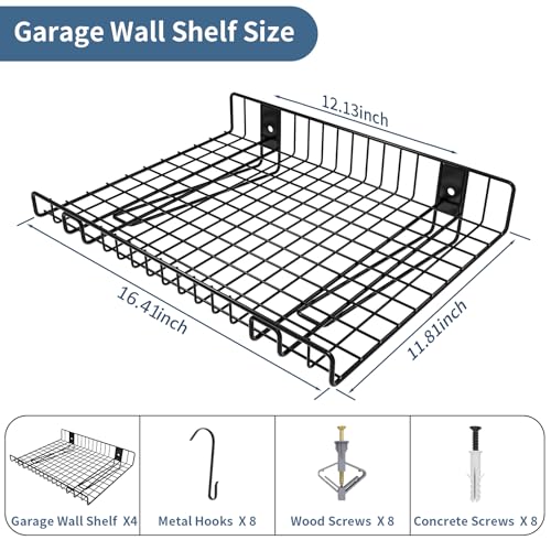 4 Garage Wall Shelf, 8 Concrete Screws, 8 Metal Hooks, 8 Wood Screws |