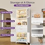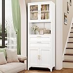 [Meet Various Storage Needs]: 75” Tall kitchen pantry cabinet features display and storage area. The 15.7 inch deep open countertop has 2 wire outlet holes, facilitating the use of appliances like microwaves and coffee machines. Both upper and lower cabinets come with adjustable shelves. You can adjust or remove the shelves based on item size, ideal for storing appliances and food. The upper glass doors and 2 large sliding drawers enable easy item – locating. It organize your space effortlessly