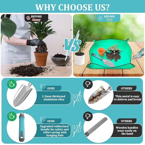 【FOLDABLE MAT + ERGONOMIC RUBBERIZED GRIPS】The ERFEI gardening tools set comes with a 25.98”x25.98” foldable repotting mat to catch soil and debris, which is a valuable addition to your gardening supplies.Its hand gardening tools, featuring stainless-steel heads and ergonomic rubberized grips, can reduce hand fatigue by 40% during extended use, making gardening more efficient. This garden tool set is truly a great choice for those who love gardening.
