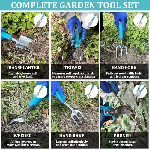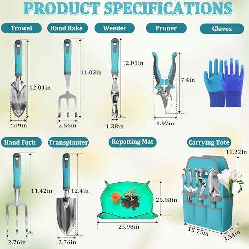 【WHAT YOU WILL GET】1 x Pruner;1 x Weeder;1 x Trowel;1 x Hand Rake;1 x Transplanter;1 x Hand Fork;1 x . Repotting Mat;1 x Gloves;1 x Carrying Tote