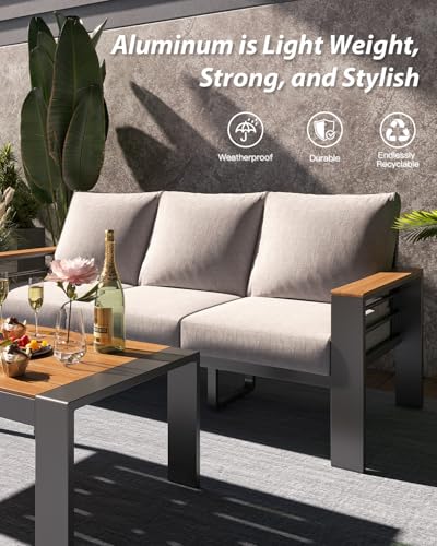 【Perfect for Any Out of doors Occasion – Rain or Shine】Host summer BBQs effortlessly: Quick-dry cushions take care of spills, the heat-deflecting wood-aluminum combo stays cool even in direct sunlight, and modular seating adapts to your space. Use as a complete conversation set or separate pieces around fire pits, gardens, or sunrooms.
