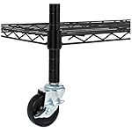 Durable steel construction with a Black finish; weight capacity per shelf: 350 pounds with leveling feet, 110 pounds with wheels no longer in motion, and 88 pounds with wheels in motion; weight capacity overall: 1400 pounds with leveling feet, 440 pounds with wheels no longer in motion, and 353 pounds with wheels in motion (in line with calmly distributed weight)