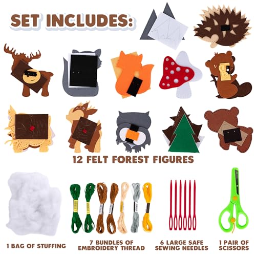 ArtCreativity Kids Woodland Animal Felt Sewing Kit, Stuffed Animal Sewing Craft Kit with 12 Characters, 6 Child-Friendly Needles, 7 Thread Bundles, 1 Bag of Stuffing & Scissors, Kids Sewing Kit 4-12