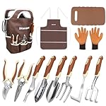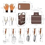 12-Piece Brown Garden Tool Set: Includes 8 gardening hand tools (scissor, pruner, crack weeder, trowel, hand fork, hand rake, trans planter, hand weeder), with gloves, a kneeling pad, garden apron, and a multi-pocket storage handbag to keep everything organized.