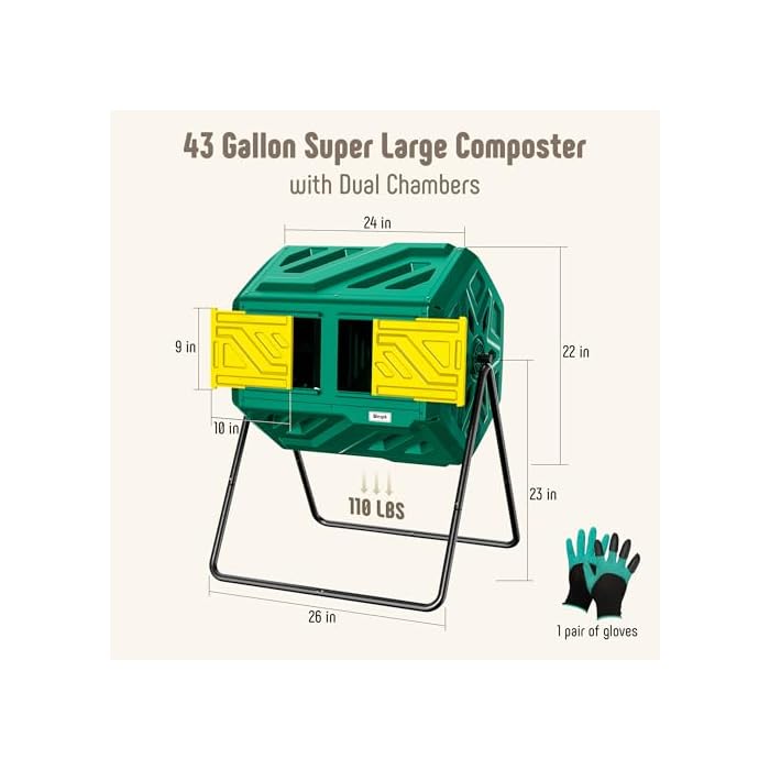 Large 43-Gallon Capacity & Dual Chamber Design: The 43-gallon dual chamber composter means that you can separate materials for faster processing. This design maximizes efficiency, saves time, and ensures sustainable composting, helping you produce more compost in less time
