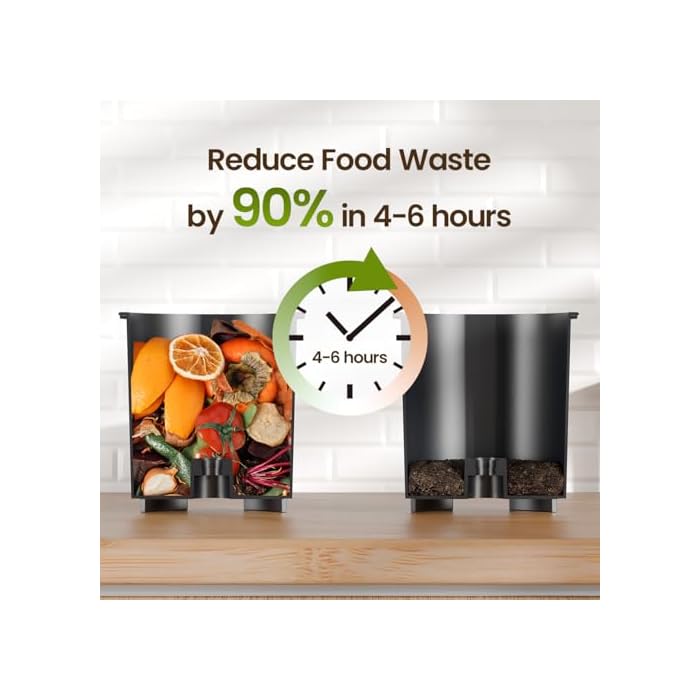 Silent operation & Energy-Efficient: The Indoor compost bin operates at a noise level below 40 decibels, so you’ll be able to work and sleep with peace of mind. More energy-efficient, only 0.51 kWh is required for one use.