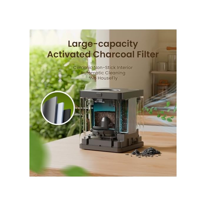 Odorless & Easy to clean: Large-capacity activated charcoal filters to soak up odours all the way through composting. The non-stick coating and one-button automatic cleaningensure that there is not any residue left inside the composting bin, making your day-to-day maintenance easier