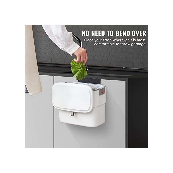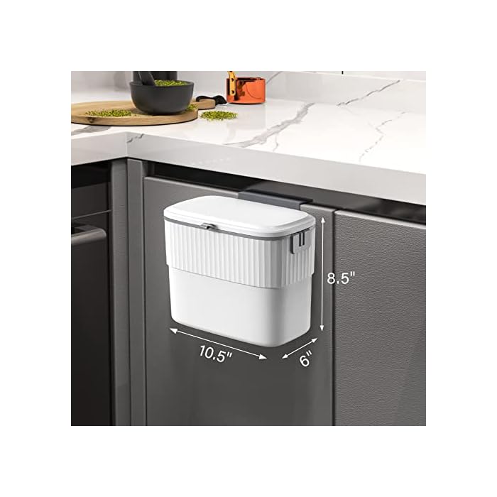 1.8 Gallon Wide Application – The 1.8 gallon trash can is compact in appearance but holds a certain amount of trash and fits perfectly into most cabinet doors, pantry doors and cupboards, not only saving you numerous space but allowing you to easily throw your trash without bending down, whether in the toilet, kitchen, bedroom, camper, RV and other small spaces, adding convenience and beauty to your life. (10.5”L x 6”W x 8.5”H)