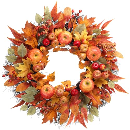 Fall Wreaths for Front Door, DECSPAS 20″ Fall Wreath with Artificial Maple Leaves Pumpkin Berries for Autumn Decor, Thanksgiving Harvest Door Decorations for Home, Wall, Window