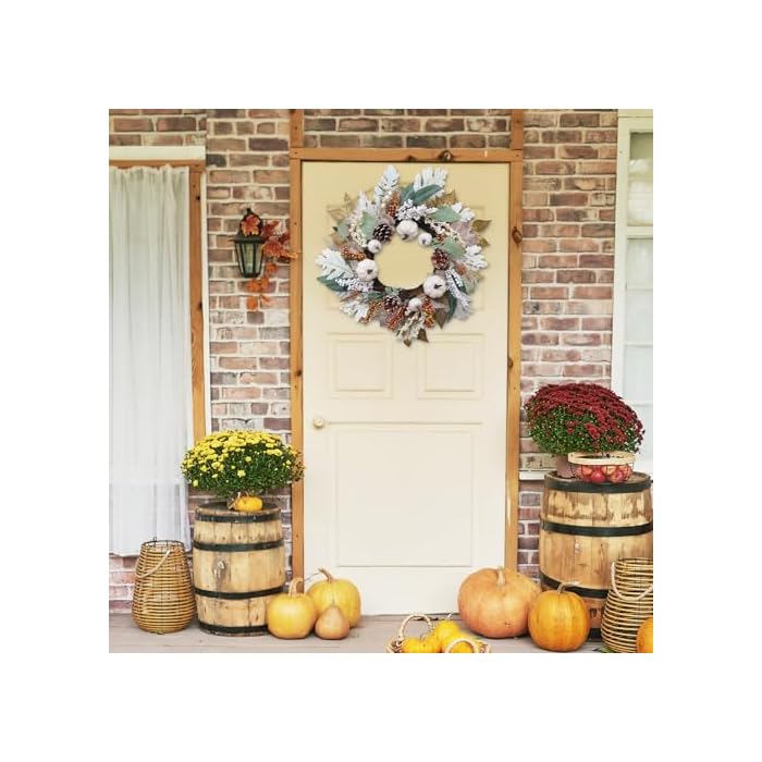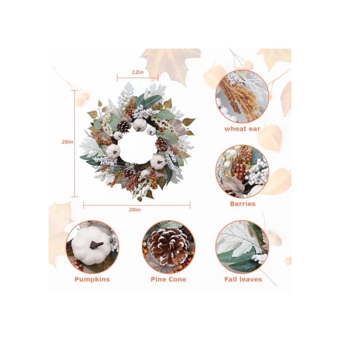 【High-quality materials】These wreaths are made from high-quality, durable polyester fabric to verify their quality. The soft white and green tones mimic the natural beauty of autumn leaves, adding a realistic touch to your autumn decor. You’ll hang the autumn wreaths anywhere you like. Along with their elegant appearance, we also place great emphasis on convenience. Each autumn wreath is packaged in a sturdy cardboard box for easy storage after use.