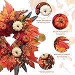 🍂【Fall Decorations for Home】: Fall door wreath is designed with natural sturdy vine base, Handcrafted with corlorful artificial maple leaves, big foam pumpkins, Berries, pine cones, acorns. It is sure to add a touch of autumn charm to your home. The front side of the lifelike polyester fabric material gives them a realistic look and feel, while being smooth to the touch and never crinkling. Get ready to add vibrant autumn hues to your everyday life with this beautifully consistent design.