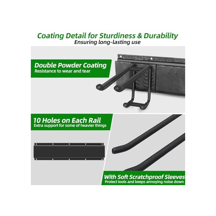 Space-Saving Design: The hooks have a nice soft coating to be able to offer protection to tools helps to keep any rattle or annoying noise down with you place thing on or take things off the rack. Tool rack Utilizes unused wall space, helping keep garage tidy and clutter-free