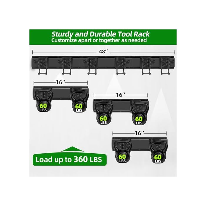 Sturdiness & Durability: The garage organizers crafted from heavy-duty alloy steel materials, ensuring long-lasting use and resistance to wear and tear, and holds up to 360LBS. Give 10 holes on every strip, extra reinforce for some of heavier things