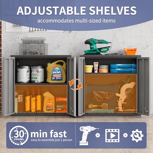 [Wall Mounted Metal Garage Cabinets]: Garage wall cabinet size 26″H x 26″W x 11.8″D,this metal wall cabinet allow it to hang securely on the wall or can be placed on the ground according meet your diverse storage needs, the wall-mounted design creates more vertical storage space. Besides, the internal shelf can be adjusted to solve your storage needs for items in different sizes without any crowd