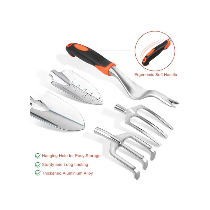 [High-quality Material]: The main body of our garden hand tools (soil scoop,small trowel, cultivator, hand rake, weeder) is made with thickened aluminum alloy material, which is rust-resistant, long lasting and extremely sturdy. Would not easily break even when dealing with thick roots or rocky soil.
