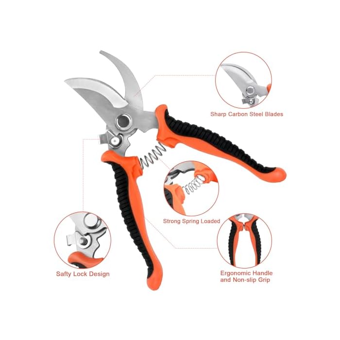 [Sharp and Safe Garden Shears]:The gardening shears are designed with carbon steel blades that are sharp for precise cutting without harm to plants. The pruning shears for gardening are lightweight and easy to hold, with a strong spring providing leverage for effortless pruning. In addition, the gardening scissors feature a safety lock design for safe storage when not in use.