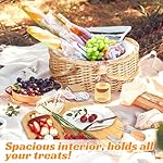 3-in-1 Multi-functional Set: This picnic basket includes a sturdy wicker basket, a detachable wooden lid that doubles as a bamboo cutting board (11.5” x 15.5”), and a foldable blanket (31.5” x 31.5”) for added convenience.