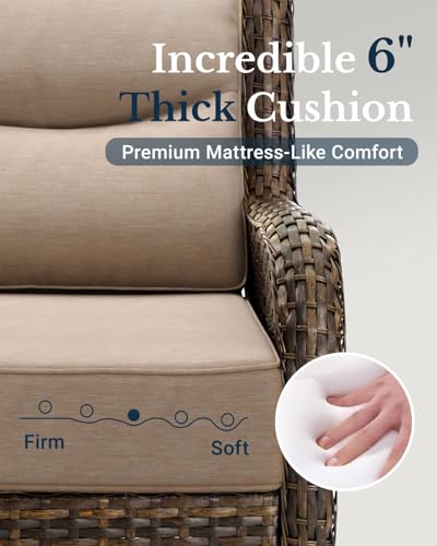 6-Inch Thick Seat Cushion: Unlike the 4″ cushions most outdoor sets use, our 6-inch cushions with high-density 28D foam offer the ideal balance of softness and support. Quick-rebound core keeps its shape, while added cotton layers and 3D backrest fill deliver extra comfort and pressure relief (Note: Ottoman cushion is 3.5″)