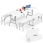 HLPB Folding Table Picnic Table Set, 6 ft Camping Table with 2 Benches, Outdoor Indoor Portable Folding Furniture for Working Meeting Party, Camping, Picnic, Weddings w/Handle and Safety Locks, White