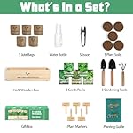 KIT INCLUDES: 5 types of herb seeds, 5 jute bags, 5 soil discs, 5 writable plant markers, 3 mini gardening tools, 1 bonsai pruner, 1 small water bottle, 1 wooden planter box and a gardening guide