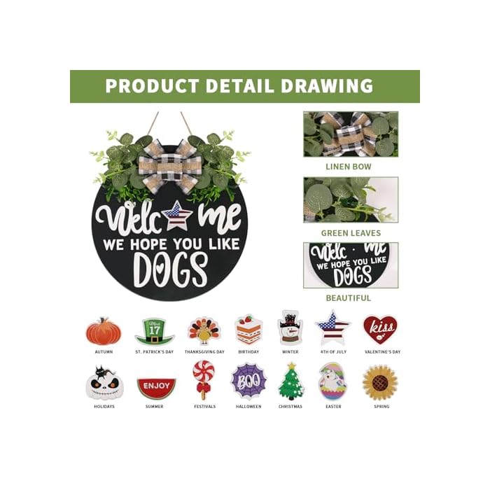 UNIQUE DESIGN: The interchangeable welcome sign features the impressive letter “Welcome We Hope You Like Dogs” paired with exquisite buffalo plaid bows, vibrant eucalyptus leaves, and 14 interchangeable logos. It not only ensures a charming appearance, but you can also change the variable icon of the wreath to change the front door decoration. At the same time, this is also a friendly and hospitable way to remind your guests that you have a dog and extend the warmest welcome to your friends.