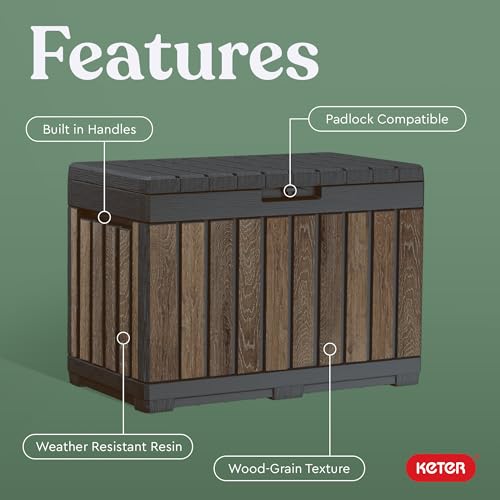 The Everwood 50 gallon storage box is a stylish and functional addition to any outside space. Its wood-look finish complements any decor and offers a 189L/50G capacity, making it ideal for organizing garages or patios. Created from durable resin material, it’s easy to assemble and has a lockable lid for added security. The signature selection of deck boxes are inspired by nature and includes a unique DECoCOAT™ texture. Ideal for protecting crucial items such as pool floats, patio cushions, and doubles as an extra seat.
