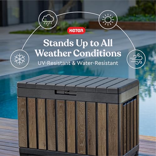 Keter Signature Everwood 50 Gallon Resin Outdoor Storage Box and Patio Furniture Side Table for Pool and Garden Accessories, Walnut