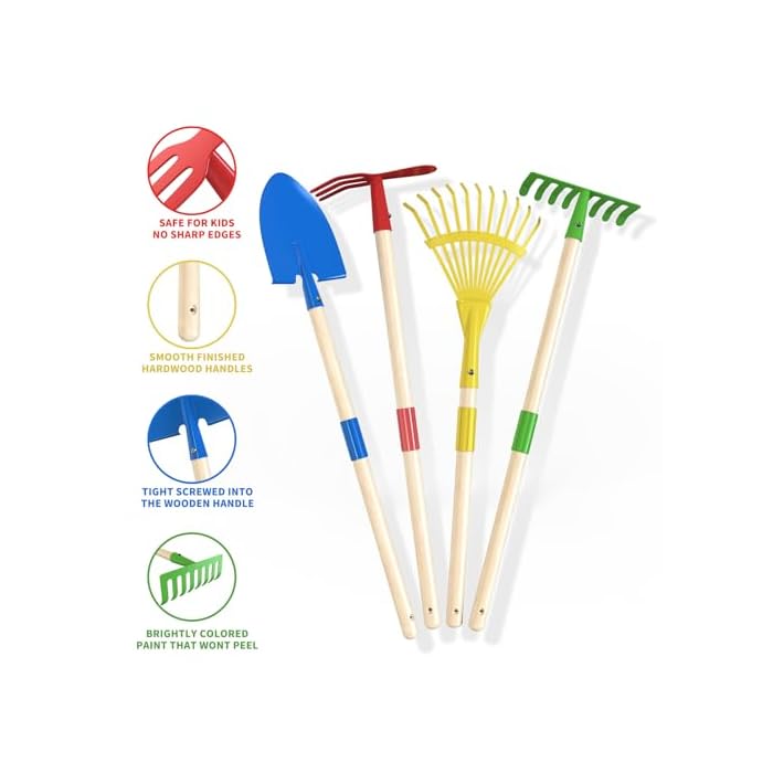 【Durable Wooden Kids Gardening Tools for All-Season Use】31.5″ long-maintain tools with thickened metal heads resist digging/planting/raking. Real metal garden tools, pre-drilled hanging holes for garage storage. Top-rated spring out of doors toys for kids with weather-resistant construction – Very best for snow shoveling toys or beach sand tools.