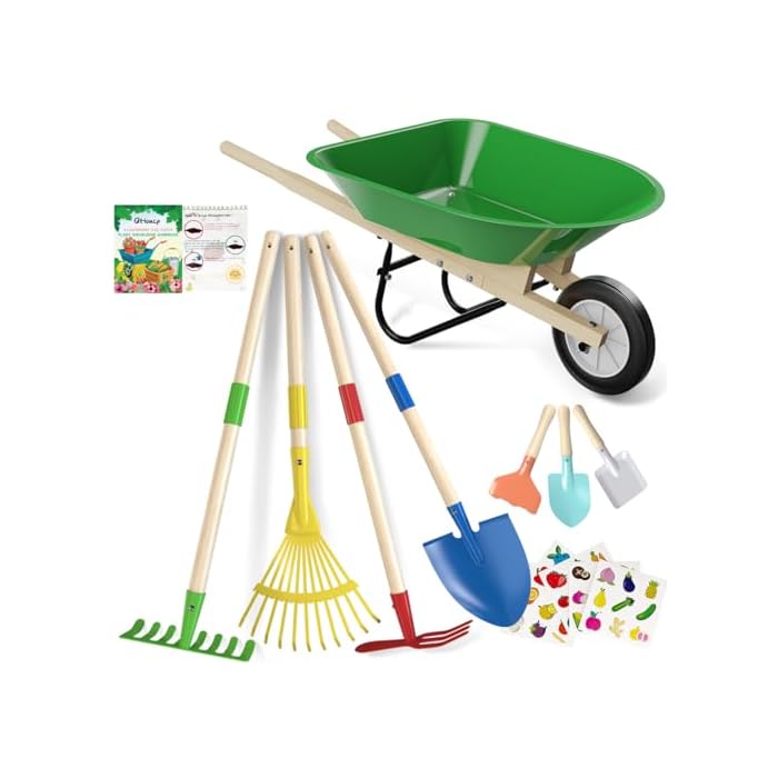 【Complete Kids Gardening Set with Wheelbarrow & Tools】All-inclusive set includes: 1 kids wheelbarrow, 4 long-maintain wooden tools (shovel/rake/hoe/leaf rake), 3 short-maintain tools (2 shovels + rake), 5 vegetable stickers, and illustrated gardening handbook. Very best for ages 3-8 to dig, plant, and harvest like real gardeners. Ideal as out of doors playset for kids, toddler gardening set with wheelbarrow, and Montessori out of doors activity kit. PLEASE CHECK WHEELBARROW INSTALLATION VIDEO, INCLUDE STEP-BY-STEP ASSEMBLY VIDEO INSTRUCTIONS!