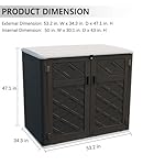 【Larger Capacity for Outdoor Storage】— External Size: 53.2 in. W x 34.3 in. D x 47.1 in. H; Interior Size: 50 in. W x 30.1 in. D x 43 in.H, Capacity: 48 Cubic Feet.This upgraded larger storage shed more perfectly store outdoor items, such as trash cans, garden tools, firewood and more suitable for all kinds of occasions: indoor, outdoor,balcony, yard, garden, street, etc.