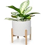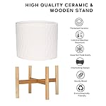 LaDoVita Ceramic Plant Pot with Stand, 10 Inch Planter with Wood Shelf, Modern Round Flower Pots Indoor with Wood Planter Holder, White Water Ripple Pattern
