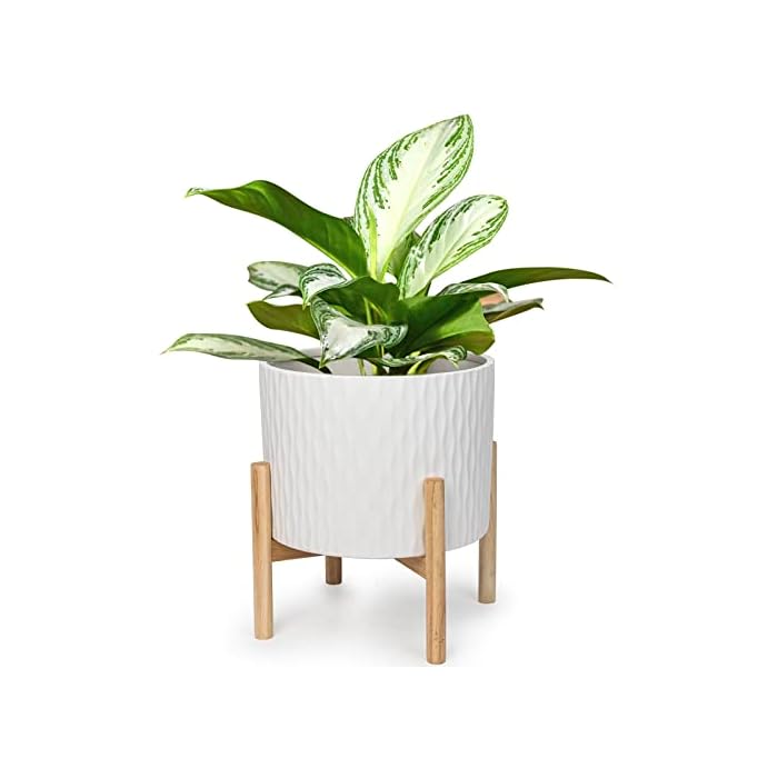 LaDoVita Ceramic Plant Pot with Stand, 10 Inch Planter with Wood Shelf, Modern Round Flower Pots Indoor with Wood Planter Holder, White Water Ripple Pattern