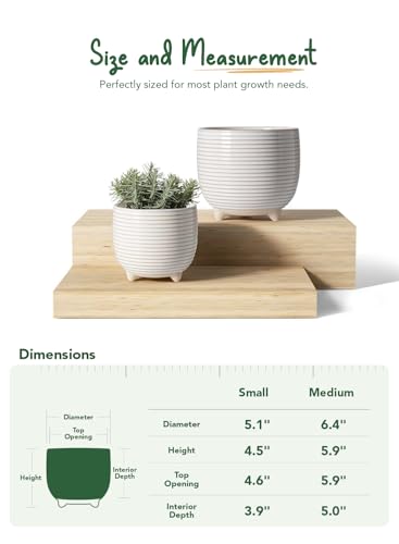 Size Matters: Large size with a 6.4 inches in diameter and a 5.9 inches in height; Small size with a 5.1 inches in diameter and 4.5 inches in height; the 5.1 inch planters are petite beauties, perfect for small succulents like Echeveria and Haworthia, in addition to compact herbs like Rosemary or Basil. the 6.4 inch planters offer room for growth even as maintaining an elegant presence; it’s just the right size for livelier plants such as Spider Plants, Pothos, and small flowering varieties