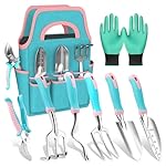 8PCS Garden Tool Sets: The garden tools for gardening comes with folding saw, serrated trower, small trowel, cultivator, hand rake, pruner, weeder, gardening gloves and an tote bag. Made from high-quality aluminum alloy, our gardening tools for women are built to last and withstands the rigors of frequent use in the garden. With garden gloves for hand protection, the 8 pieces garden kit are easier to fix up your garden.