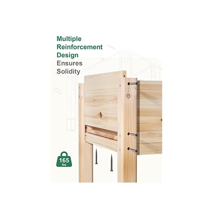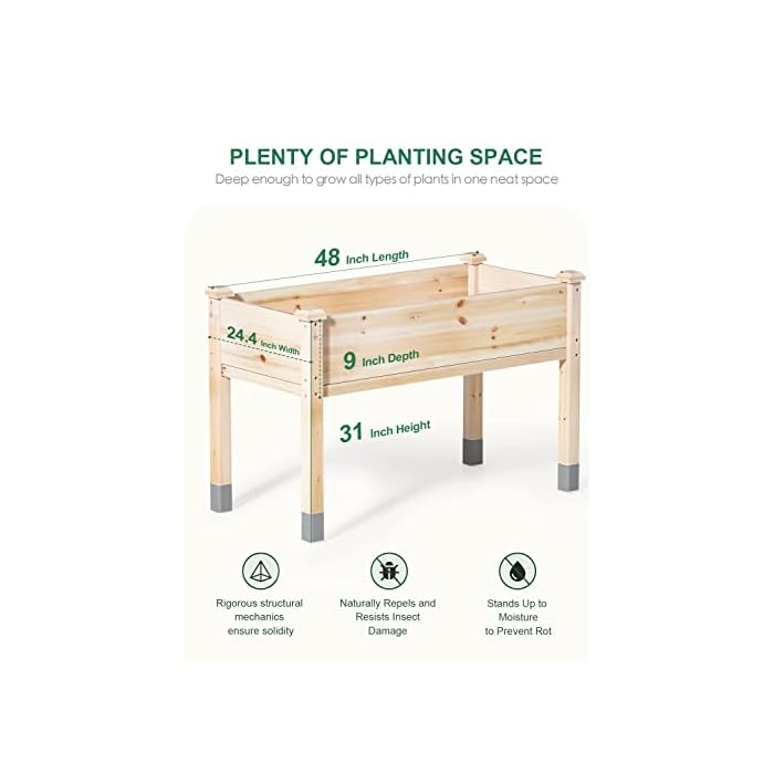 Reasonable Size and Wood Combination: MIXC raised garden beds is made of untreated fir wood, which resists warping and splitting through the years better than cedar. The enhance part is made of Pinus radiata with better load-bearing properties. Overall Dimension: 48”(L) X 24.4”(W) X 31”(H). 9” Deep.