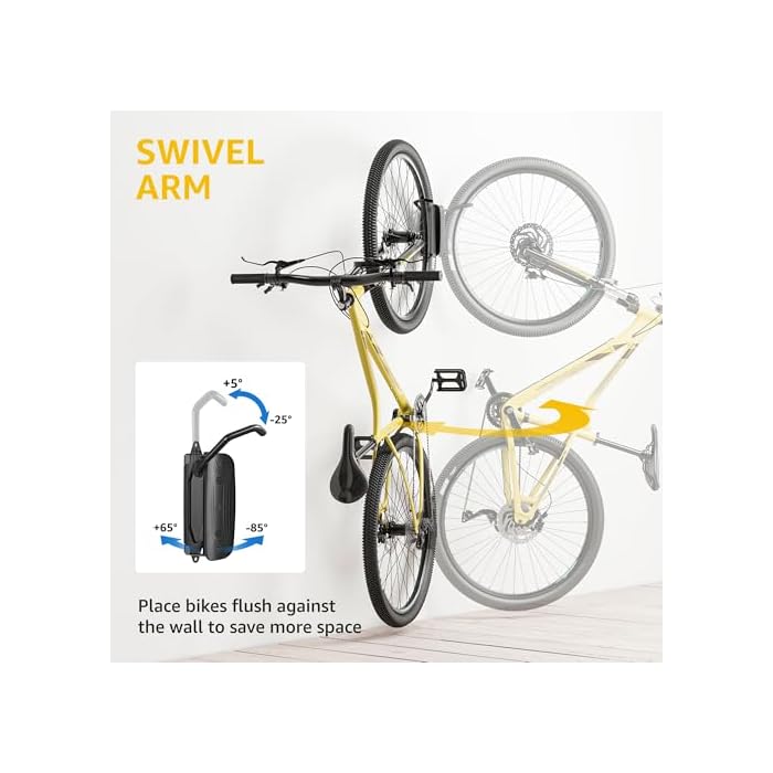 【Upgraded 150° Swivel Design】 Swivel design with bearing system, swivel bike rack wall mount conveniently stores bikes in center, left or right-angled position, making it a convenient storage solution around parked cars and inside apartments. The swivel system allows you to store bike flush against the wall. Just hook the front wheel in place, rest the back wheel on the stabilizer, and then rotate the bike wall hanger to the desired angle.