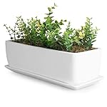 MyGift 14 Inch Ceramic Indoor Plant Pot with Drainage Hole, Rectangular Succulent Planter Window Box with Removable Saucer, Unglazed White