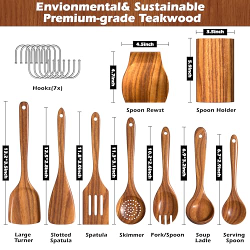 Natural Teak Kitchen Cooking Utensil Set with Holder, Wooden Spoons for Cooking, 10PCS Cooking Spatulas Set with Spoon Rest, Wooden Utensil Set for Nonstick Cookware Sturdy & Lightweight